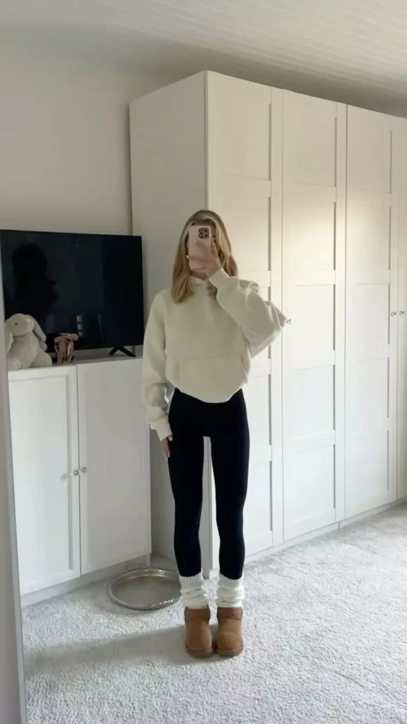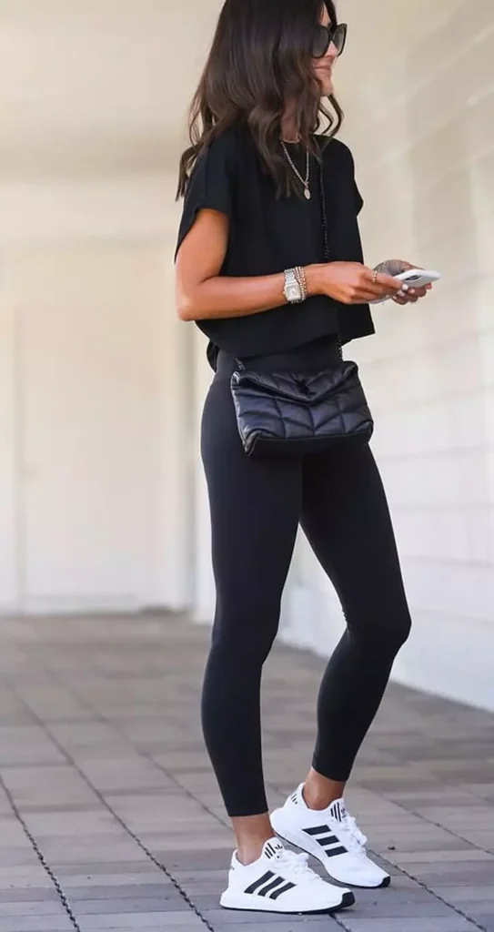 Athleisure has taken over fashion in recent years, and leggings are at the heart of this trend. High-waist leggings paired with a cropped hoodie, sports bra, or oversized jacket and sneakers create a sporty yet chic look. This outfit is perfect for casual meet-ups, running errands, or light outdoor activities. Accessories like a baseball cap or crossbody bag can enhance the athleisure vibe. Athleisure chic is all about combining functionality with fashion, showing that you can be active and stylish at the same time.