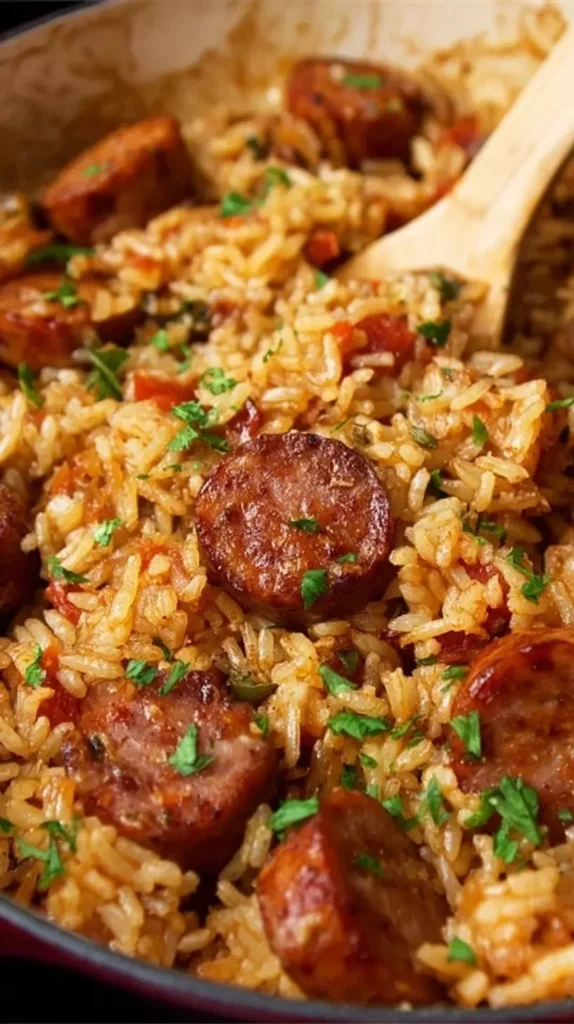 Everything cooks together, and the rice absorbs all the flavor from the sausage.